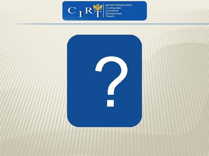 INTERNATIONAL CORPORATION CONT. q Full membership in FIRST since February 2013. godine q Regional Corporation: Slovenian SI-CERT i Croatian Carnet CERT q Terena, Trusted Introduces, CIRT. ME listed q The advantages of membership in international organizations: -Assistance in resolving incidents -Training -Possibilities to use forensics capabilities -Direct communications with CERT/CIRT teams around the world -Access to security information database
