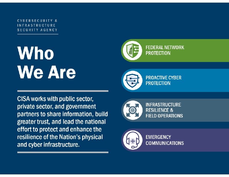 Cybersecurity and Infrastructure Security Agency (CISA) Mission: CISA partners with industry and government to understand manage risk to our Nation's critical infrastructure Vision: Secure and resilient infrastructure for the American people CISA executes DHS’s PPD-21 Sector Specific Agency (SSA) roles and responsibilities. CISA coordinates security and resilience efforts using trusted partnerships across the private and public sectors, and delivers technical assistance and assessments to federal stakeholders as well as to infrastructure owners and operators nationwide.