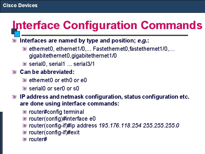 Cisco Devices Interface Configuration Commands Interfaces are named by type and position; e. g. : ethernet 0, ethernet 1/0, . . . Fastethernet 0, fastethernet 1/0, … gigabitethernet 0, gigabitethernet 1/0 serial 0, serial 1. . . serial 3/1 Can be abbreviated: ethernet 0 or eth 0 or e 0 serial 0 or ser 0 or s 0 IP address and netmask configuration, status configuration etc. are done using interface commands: router#config terminal router(config)#interface e 0 router(config-if)#ip address 195. 176. 118. 254 255. 0 router(config-if)#exit router#