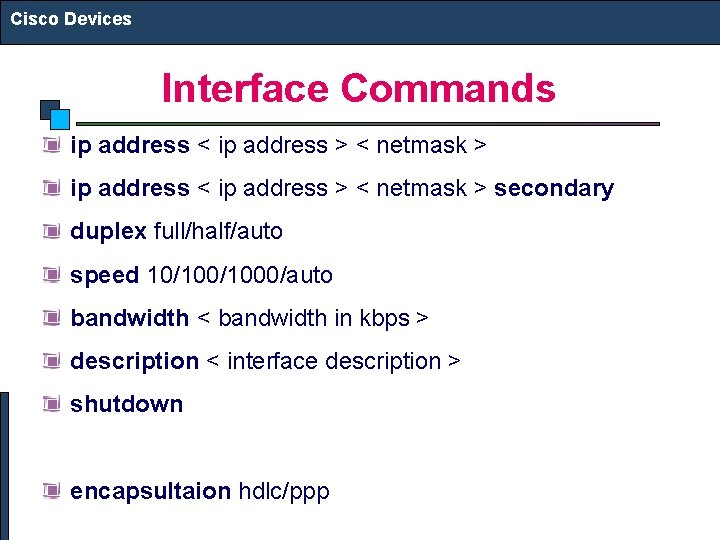 Cisco Devices Interface Commands ip address < ip address > < netmask > secondary duplex full/half/auto speed 10/1000/auto bandwidth < bandwidth in kbps > description < interface description > shutdown encapsultaion hdlc/ppp