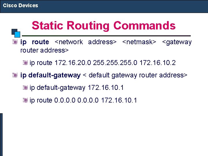 Cisco Devices Static Routing Commands ip route <network address> <netmask> <gateway router address> ip route 172. 16. 20. 0 255. 0 172. 16. 10. 2 ip default-gateway < default gateway router address> ip default-gateway 172. 16. 10. 1 ip route 0. 0 172. 16. 10. 1