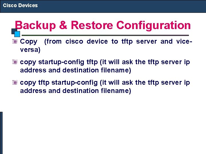 Cisco Devices Backup & Restore Configuration Copy (from cisco device to tftp server and viceversa) copy startup-config tftp (it will ask the tftp server ip address and destination filename) copy tftp startup-config (it will ask the tftp server ip address and destination filename)