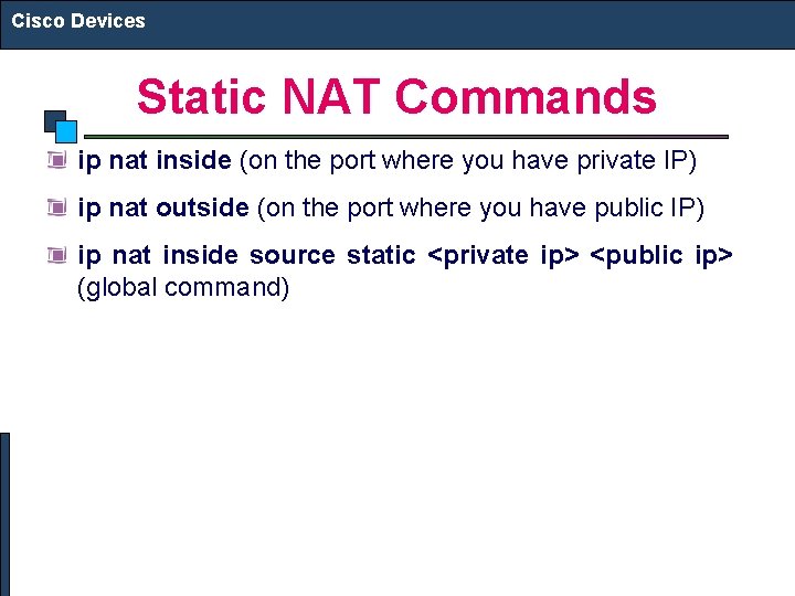 Cisco Devices Static NAT Commands ip nat inside (on the port where you have private IP) ip nat outside (on the port where you have public IP) ip nat inside source static <private ip> <public ip> (global command)