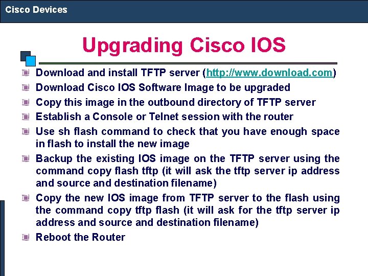 Cisco Devices Upgrading Cisco IOS Download and install TFTP server (http: //www. download. com) Download Cisco IOS Software Image to be upgraded Copy this image in the outbound directory of TFTP server Establish a Console or Telnet session with the router Use sh flash command to check that you have enough space in flash to install the new image Backup the existing IOS image on the TFTP server using the command copy flash tftp (it will ask the tftp server ip address and source and destination filename) Copy the new IOS image from TFTP server to the flash using the command copy tftp flash (it will ask for the tftp server ip address and source and destination filename) Reboot the Router