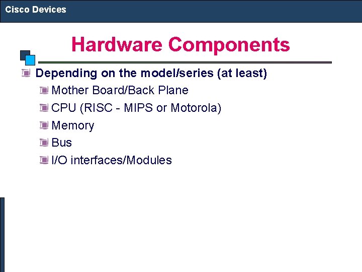 Cisco Devices Hardware Components Depending on the model/series (at least) Mother Board/Back Plane CPU (RISC - MIPS or Motorola) Memory Bus I/O interfaces/Modules