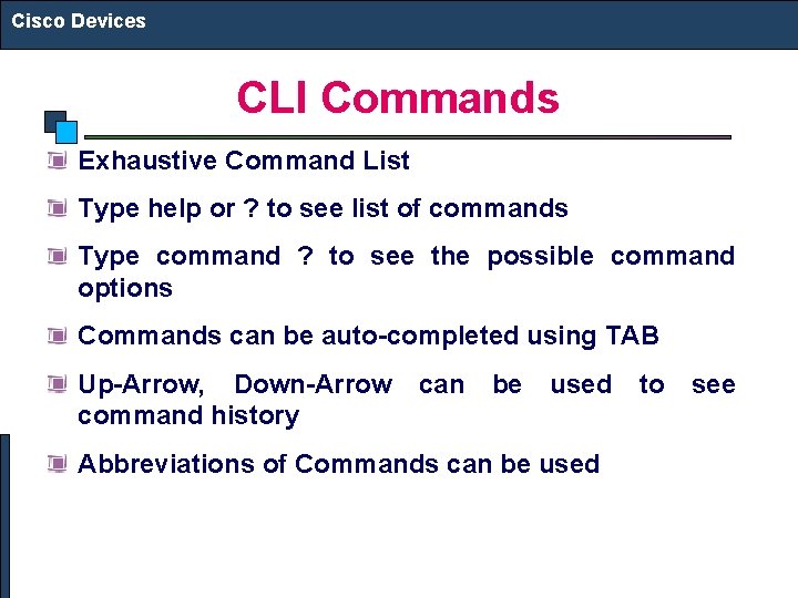 Cisco Devices CLI Commands Exhaustive Command List Type help or ? to see list of commands Type command ? to see the possible command options Commands can be auto-completed using TAB Up-Arrow, Down-Arrow command history can be used Abbreviations of Commands can be used to see