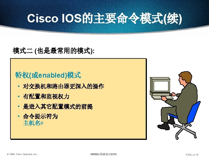 登入交换机并键入特权模式密码 控制台 > > enable Enter password: # # disable > quit © 1999, Cisco Systems, Inc. 用户模式提示 特权模式提示 www. cisco. com ICND— 4 -15