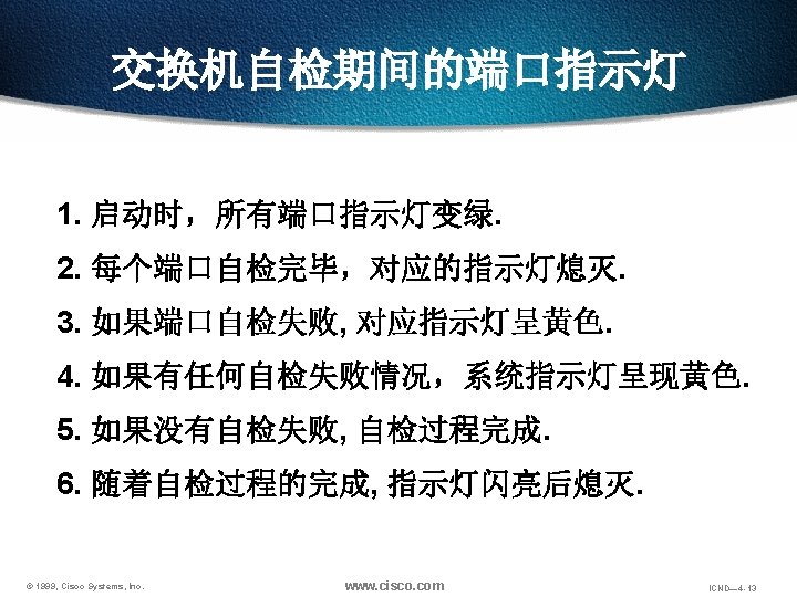 检查交换机指示灯(LEDs) © 1999, Cisco Systems, Inc. www. cisco. com ICND— 4 -12