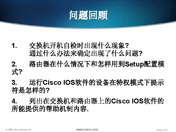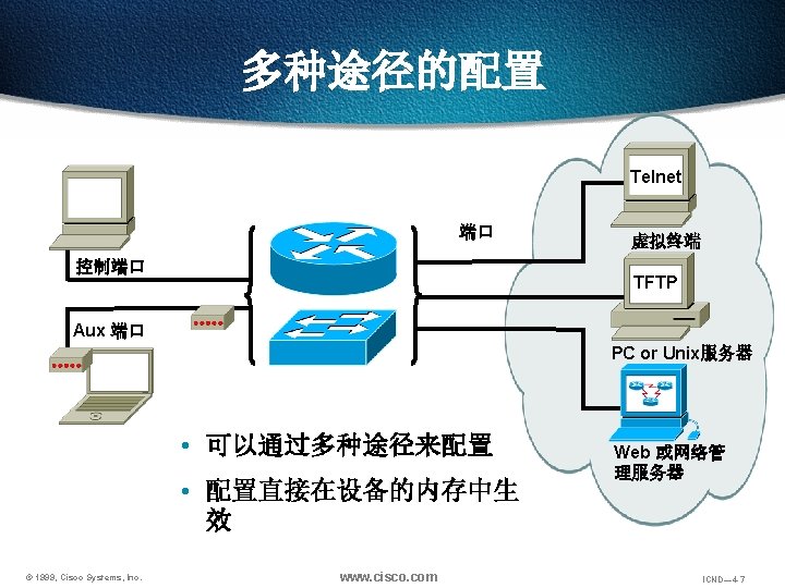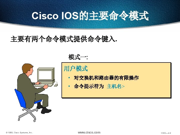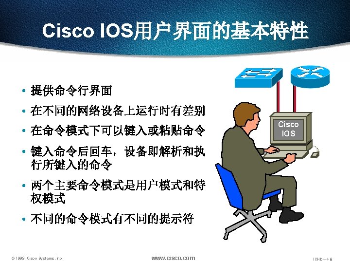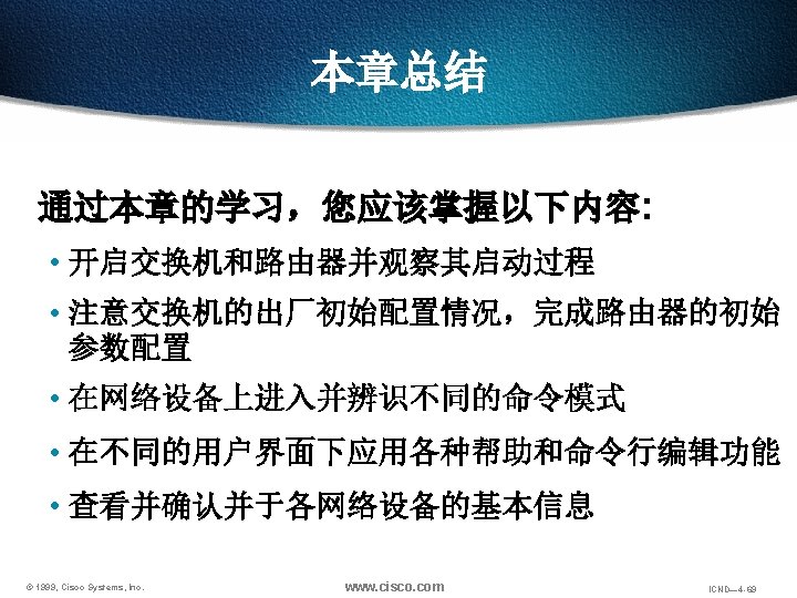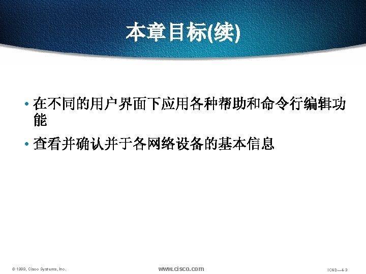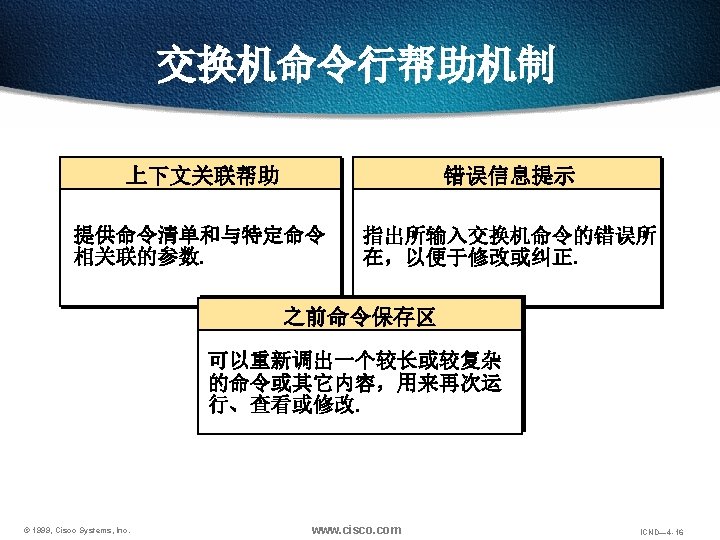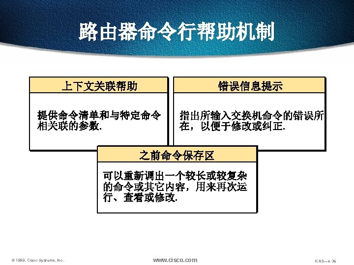 回览之前用过的命令 Ctrl-P or Up arrow 调出最近(前一)使用过的命令 Ctrl-N or Down arrow 调出更近使用过的命令 Router> show history 显示命令保存区内容 Router> terminal history size lines 设置命令保存区大小 © 1999, Cisco Systems, Inc. www. cisco. com ICND— 4 -48