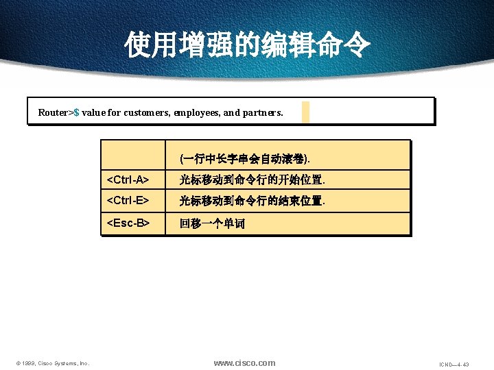 使用增强的编辑命令 Router>$ value for customers, employees, and partners. (一行中长字串会自动滚卷). © 1999, Cisco Systems, Inc. <Ctrl-A> 光标移动到命令行的开始位置. <Ctrl-E> 光标移动到命令行的结束位置. www. cisco. com ICND— 4 -42