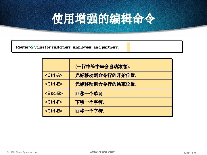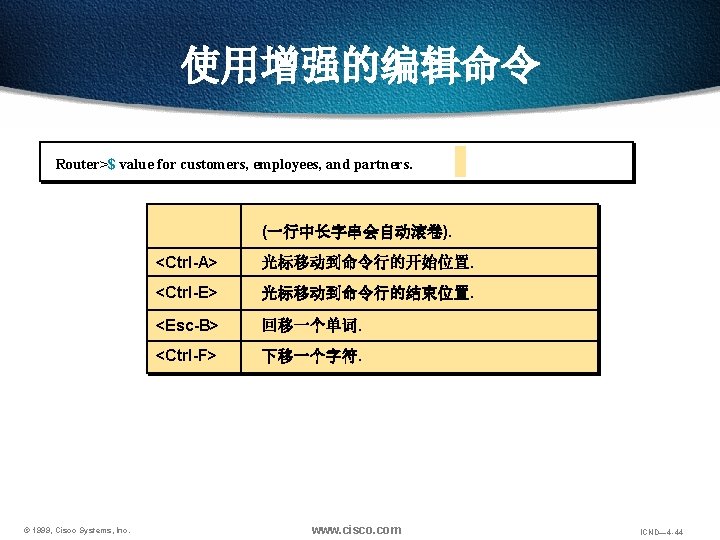 使用增强的编辑命令 Router>Shape the future of internetworking by creating unpreced “Shape the future of internetworking by creating unprecedented value for customers, employees, and partners. ” 上述文字段在输入时会超出一行 © 1999, Cisco Systems, Inc. www. cisco. com ICND— 4 -39