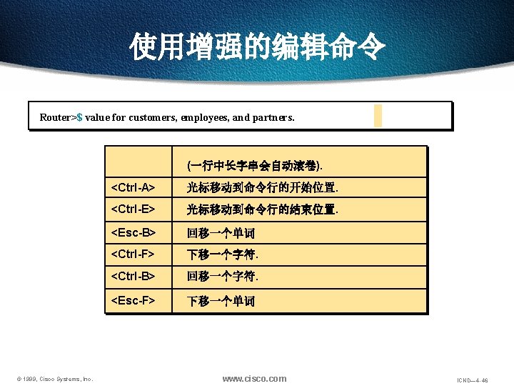 使用增强的编辑命令 Router>$ future of internetworking by creating unprecedented op (一行中长字串会自动滚卷). © 1999, Cisco Systems, Inc. www. cisco. com ICND— 4 -40