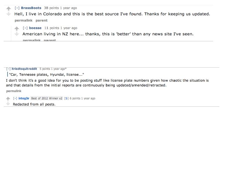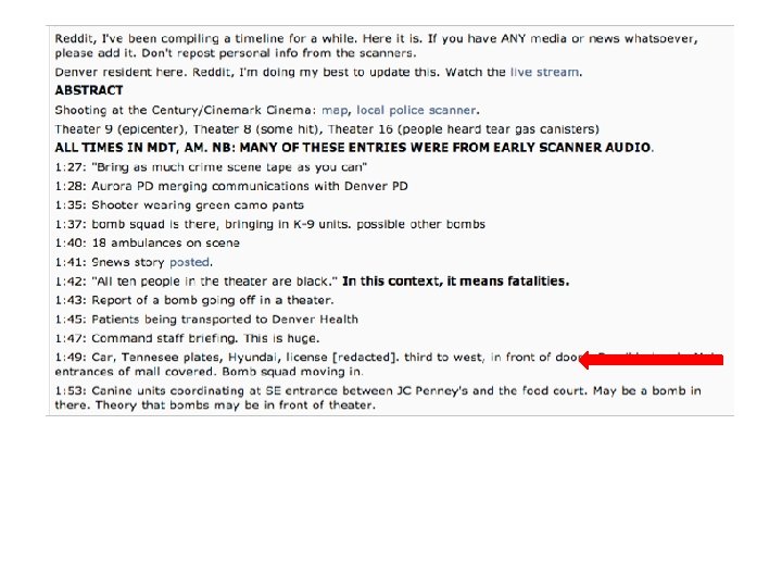 Example When the “Dark Knight” shooting occurred at a movie theater in Aurora, Colorado, citizens used the Reddit website to post as much information as they could find about what was happening.
