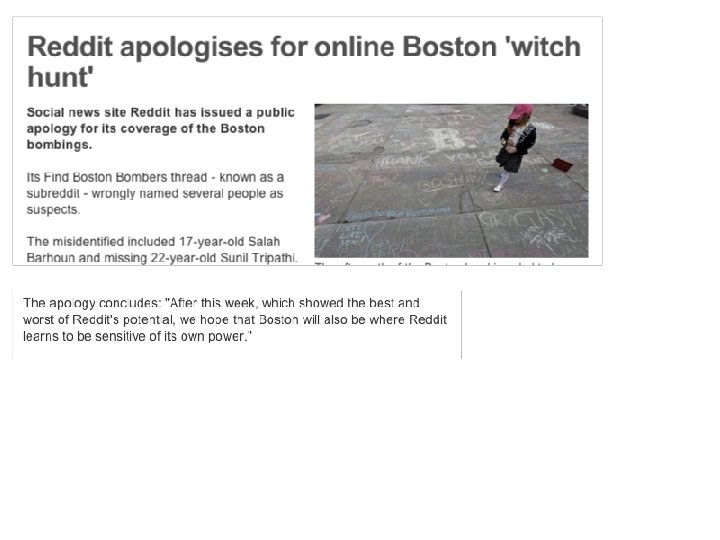 Example During the Boston Marathon bombings, users posted photos to Reddit in the hopes of helping police catch the bombers. Instead, citizen journalists launched a witch hunt for what turned out to be innocent bystanders.