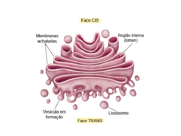 ORGANELAS CITOPLASMÁTICAS COMPLEXO DE GOLGI • Ocorrência: Em células eucariontes, próximo ao núcleo e ao RE • Estrutura: - Grupo de cisternas achatadas, formadas por membrana lipoprotéica, empilhadas umas sobre as outras. As cisternas são denominadas sáculos ou dictiossomos. • Face Cis ou Face Formativa = estão voltadas para RER. • Face Trans ou Face de Maturação = é a face em que brotam as vesículas contendo proteínas modificadas e selecionadas de acordo com o seu destino.