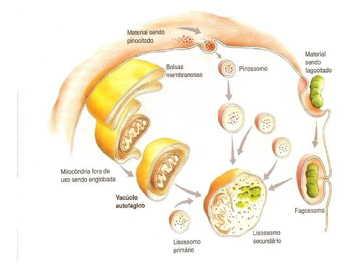 ORGANELAS CITOPLASMÁTICAS LISOSSOMOS • Ocorrência: Em células eucariontes, dispersos no citoplasma. • Estrutura: São bolsas membranosas produzidas pelo complexo de Golgi que contêm enzimas digestivas. o Autofagia: Renovação celular • Função: Digestão intracelular o Heterofagia: Fagocitose e Pinocitose o Autólise: Morte programada a) Autofagia: É a digestão das próprias organelas citoplasmáticas o Renovação das organelas e em caso de falta de alimento b) Heterofagia: É a digestão de substâncias que entram na célula Lisossomo 1º funde-se ao fagossomo ou pinossomo Forma-se lisossomo secundário ou vacúolo digestivo Ocorre a digestão dos componentes úteis para a célula