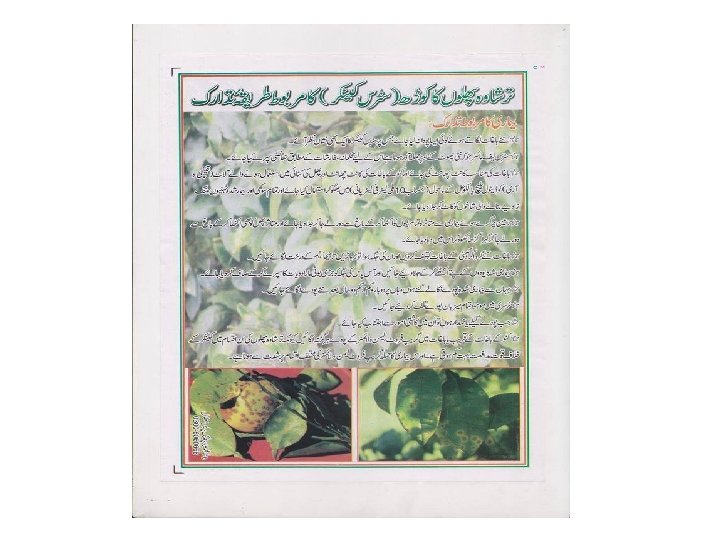 Citrus Canker 1 - Citrus Canker (Xanthomonas compestris) Bacterial disease Appear on leaves, branches, fruit a- Symptoms 1. Small yellow spots are formed on upper epidermis, then on lower epidermis 2. Later, spots become bigger, brown, raised 3. Diseased area die and leaving hole 4. Spots also appear on twigs and fruit drop Example: K lime, Lemon, Grapefruit, Sweet lime, Sweet orange b- Corrective measure 1. Selection of healthy nursery plants 2. Prune the affected part and spray with bacteriaside
