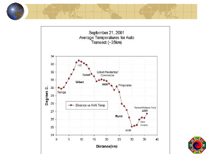 Temperature distribution within a city Variation within a city / Horizontal distribution Street intersection – (the coldest place) Heavily traveled main roads (2 degree ) Around stop light (2 -3 degree )