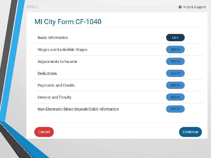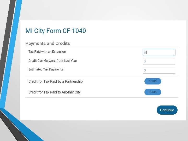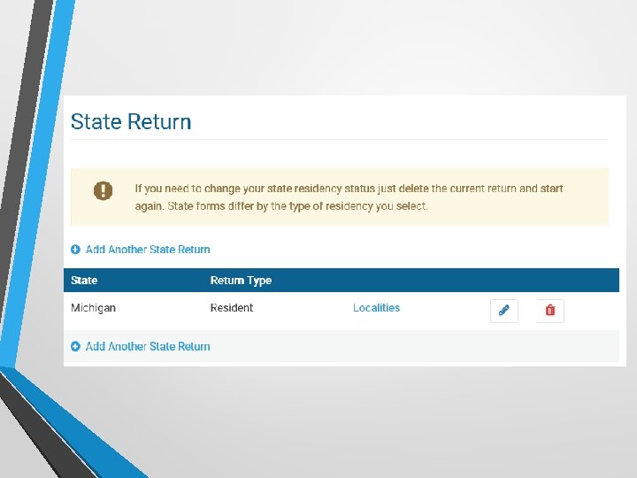 City Tax Returns • 22 Michigan cities have city income tax • Common ones seen at the West Michigan sites include but are not limited to, Muskegon Heights, Grand Rapids, and Walker • Detroit has it’s own set of city forms but every other city uses the “Michigan Cities Common Form” to report city taxes