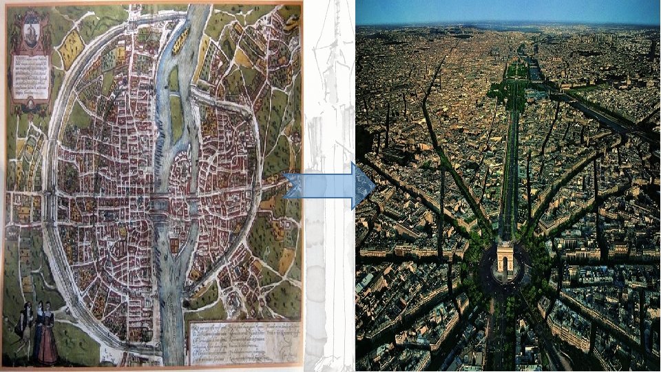 • Dentro de la renovación de la ciudad Haussmann Consideró: - La regulación pública : expropiando terrenos, definiendo una nueva altura de edificios y regularizando la fachada. - Construcción de una red de grandes avenidas. - La creación de un gran bulevar ( Saint Michel), que conecta al centro de la ciudad y las grandes alamedas, eliminando infinitos callejones característicos del antiguo parís. - Cada bulevar conectaba además a una plaza. - Se amplían los ductos de agua y desechos.