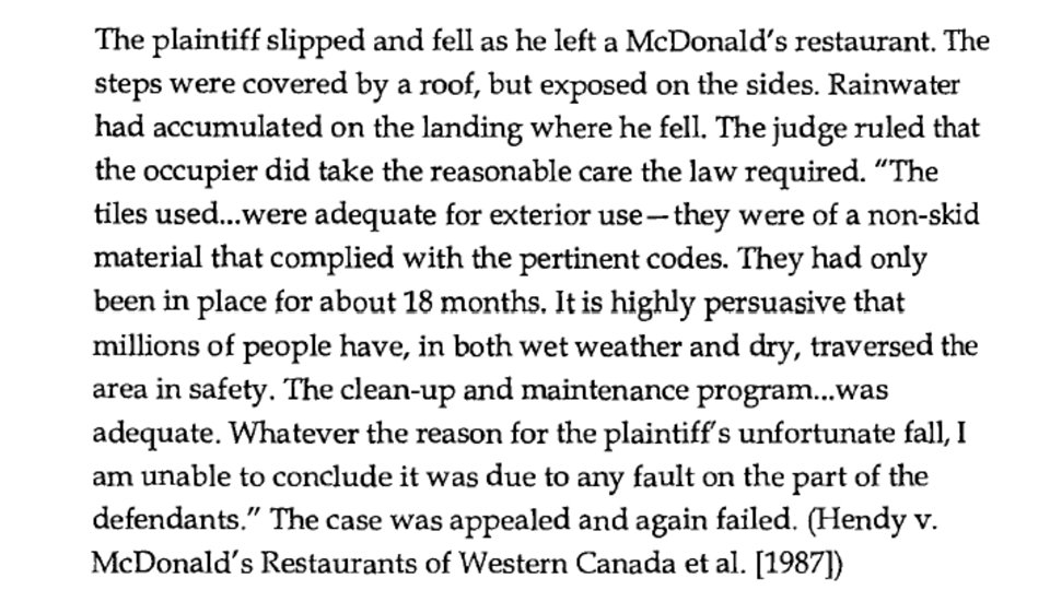 Product Liability • In 1932, a woman became ill after finding a decaying snail in her bottle of ginger beer • She sued, and for the first time, manufacturers were held responsible for their products even if there was no direct relationship between the customer and the manufacturer (Donoghue v. Stevenson) • Since then, courts have increasingly held manufacturers responsible for injuries resulting from products that are inadequately designed, badly assembled, or not accompanied by clear instructions and hazard warnings • Typical examples of product liability are: • A power saw manual doesn't warn buyers about hazards or show to use the saw correctly; a customer cuts off two fingers and sues • Thalidomide, a drug taken by expectant mothers, causes birth defects; parents sue the manufacturer on behalf of their children • A commonly used insulation material, asbestos, is found to cause lung cancer; manufacturers are sued by dying asbestos mill workers and by building owners who must remove the asbestos