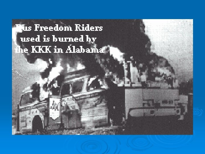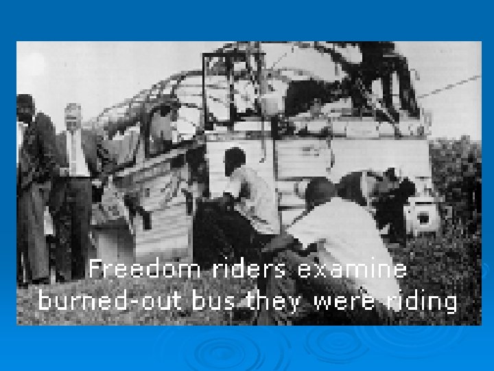 Freedom Riders were protesters who rode buses w/the goal of integrating buses & bus stations. In 1961, a bus of Freedom Riders was attacked in Anniston, Alabama, where a white mob burned the bus. Another instance occurred when a group of Nashville students rode into Birmingham, Alabama, where they were beaten.