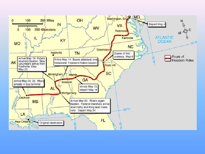 Freedom rides Summer 1961 • Test the federal government’s willingness to enforce that segregation on interstate buses was illegal (Boynton v. Virginia 1960) • En route, they defied segregation codes • In Alabama firebombed one bus and attacked the riders of the second bus