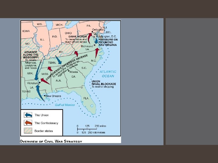 Major Battles of the Civil War First Battle of Bull Run (July 1861) First major battle of the war Union significantly defeated by Confederates Myth of quick war leads to realization of long and costly war Antietam (September 1862) Bloodiest day in war: 22, 000 killed or wounded Lincoln soon issues Emancipation Proclamation Vicksburg (May-July 1863) Union control of the Mississippi River, cutting the CSA in two Gettysburg (July 1863) CSA’s Lee’s offensive into Pennsylvania to force peace by the Union or earn foreign support Pickett’s Charge and failure and near destruction of CSA military Deadliest battle of the entire war: over 50, 000 casualties Widely considered the turning point of the war for a Union victory