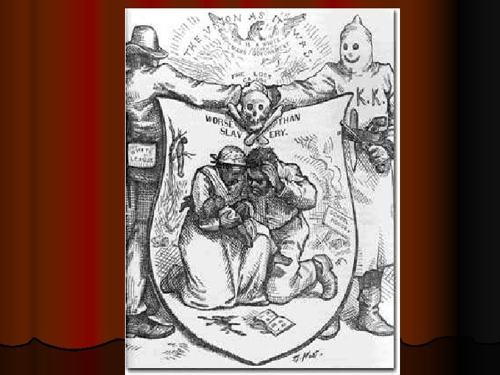 l Started Ku Klux Klan when six former Confederate soldiers decided to pretend to be ghosts of soldiers returned for revenge l It turned into a way to intimidate & harass people who chose to vote for the Republicans l Enforcement Act of 1870~ banned the use of terror, force, or bribery to keep people from voting. Was ineffective.