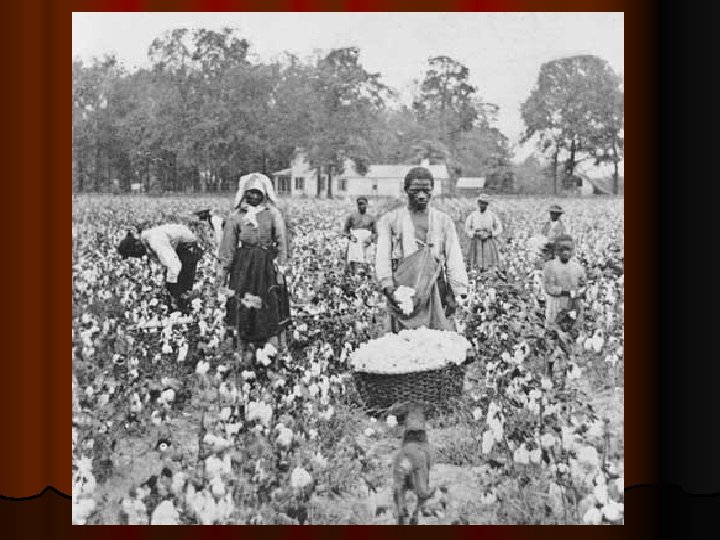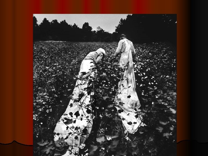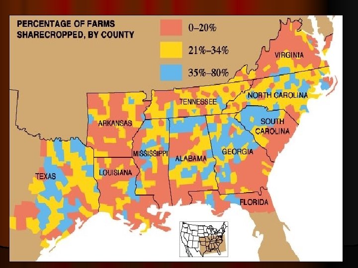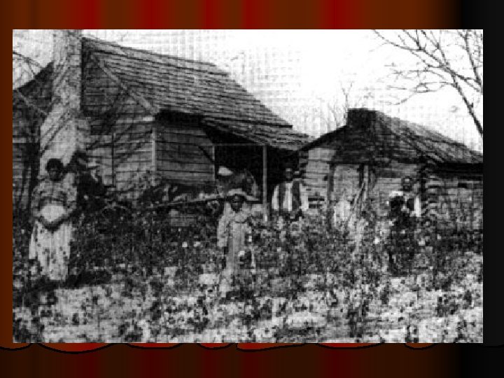 l In Sharecropping (cont. ) sharecropping, the planter provided housing & credit at a local store. l By the time that the harvest came in, the family owed more money than they received for their crops. l They then started out the next year already in debt, and most of the time continued to get deeper & deeper in debt l Sharecropping became another form of virtual slavery