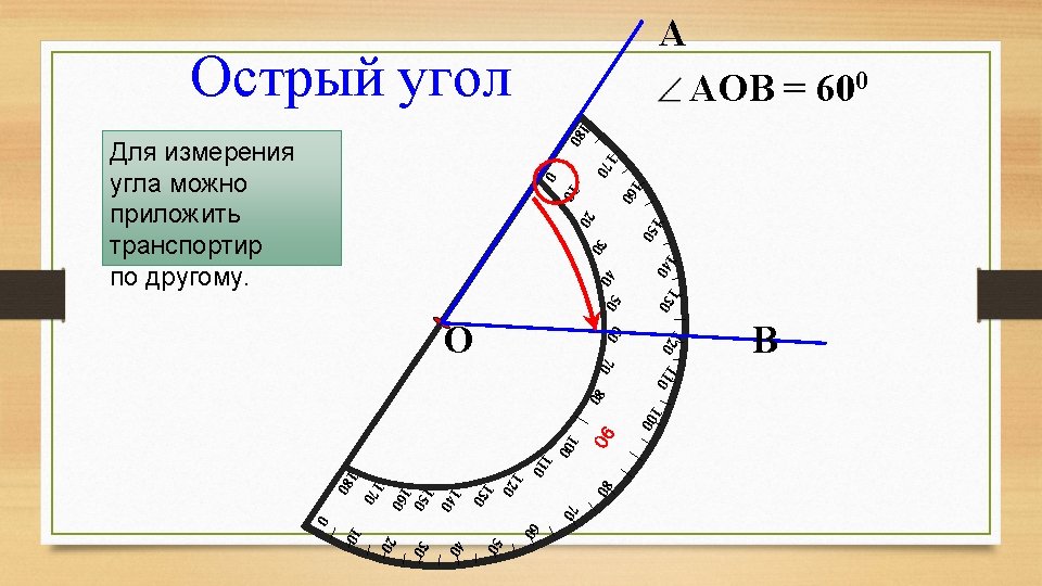 Острый угол - это угол, градусная мера которого меньше 90 градусов. 120 110 60 70 80 100 70 110 50 120 40 130 30 140 30 150 160 20 170 10 0 АОВ = 600 60 40 160 180 80 50 170 100 90 130 140 А 180 О 20 10 0 В