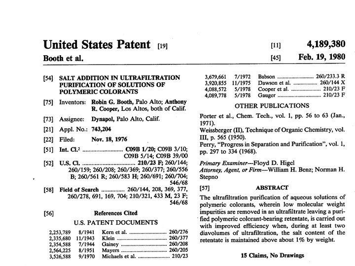 Original Claim – Rebhahn Application In a process for the purification of a dye. . . the improvement which comprises: subjecting an aqueous solution to ultrafiltration through a membrane having a nominal pore diameter of 5 -15 Angstroms under a hydrostatic pressure of approx. 200 -400 p. s. i. g. to thereby cause separation of said impurities from said dye. . .
