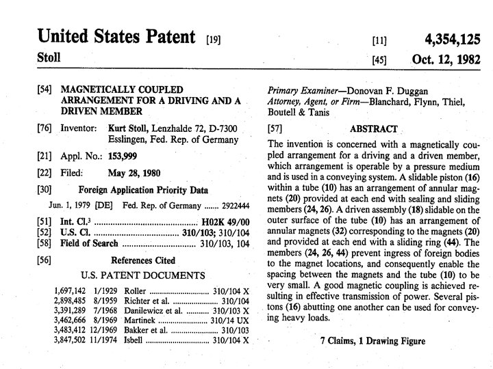 • United States Patent 4, 354, 125 Stoll October 12, 1982 Magnetically coupled arrangement for a driving and a driven member The invention is concerned with a magnetically coupled arrangement for a driving and a driven member, which arrangement is operable by a pressure medium and is used in a conveying system. A slidable piston (16) within a tube (10) has an arrangement of annular magnets (20) provided at each end with sealing and sliding members (24, 26). A driven assembly (18) slidable on the outer surface of the tube (10) has an arrangement of annular magnets (32) corresponding to the magnets (20) and provided at each end with a sliding ring (44). The members (24, 26, 44) prevent ingress of foreign bodies to the magnet locations, and consequently enable the spacing between the magnets and the tube (10) to be very small. A good magnetic coupling is achieved resulting in effective transmission of power. Several pistons (16) abutting one another can be used for conveying heavy loads. Inventors: Stoll; Kurt (Lenzhalde 72, D-7300 Esslingen, DE) Appl. No. : 153999 Filed: May 28, 1980