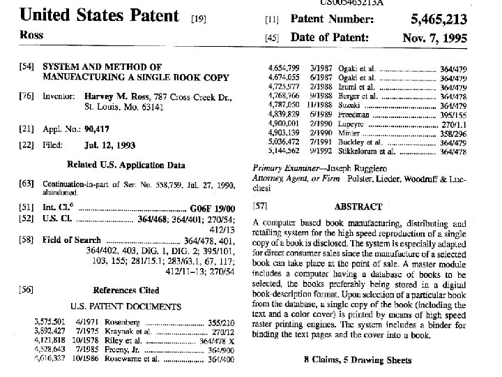 “It is therefore an object of the invention to provide a book manufacturing system which is capable of storing data corresponding to the text and color graphical cover of tens of thousands of different books, as well as promotional sales text and color graphics for aiding the consumer in choosing a book for purchase, and facilitate the high speed manufacture of a single copy …. ” -- Ross patent spec.