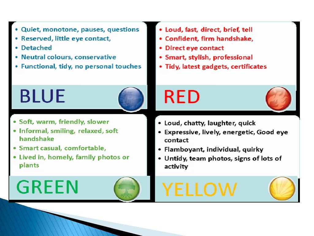 Clarity 4 D – Energy’s (WATER) BLUE energy is shown by people who are introspective and reserved. They like to observe others and think before taking action. They are happy in their own company, and can give an independent, detached analysis, which can sometimes give the impression of aloofness. (FIRE) RED energy is demonstrated by people who are highly energetic and action orientated. They are positive, straight-talking and assertive. They tend to be goal-focussed and enjoy the challenge of achieving quick results. They are pragmatic thinkers who have an objective approach which can sometimes overlook the needs of other people. (EARTH) GREEN energy is observed in people who are warm and friendly in an understated way. They value close relationships and will be loyal and supportive of their family and friends. They like to create a harmonious atmosphere and prefer consensus to confrontation, which can sometimes make them appear indecisive and laidback. (AIR) YELLOW energy is displayed by people who are out-going, sociable and fun-loving. They particularly enjoy the company of other like-minded people and frequently stand out in a crowd, often enjoying being the centre of attention. They are persuasive, charming and can sometimes overwhelm people with their enthusiastic energy.