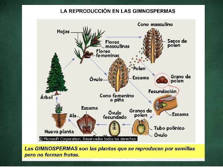 GIMNOSPERMAS Son plantas más primitivas, que tienen FLORES CON ASPECTO LEÑOSO que no son vistosas, llamadas PIÑAS. Todos son árboles o arbustos. El polen es transportado por el viento y cuando se produce la fecundación, se forman SEMILLAS (piñones) que no se guardan en frutos. . Las flores son MASCULINAS o FEMENINAS. Normalmente, las masculinas se sitúan arriba y las femeninas, abajo, para así recibir el polen. Las plantas de este grupo son las CONÍFERAS, los CIPRESES, ENEBROS, SABINAS y algunas más. La mayoría tienen hojas finas llamadas ACÍCULAS (pinos, abetos) o como si fuesen escamas (enebros, sabinas).