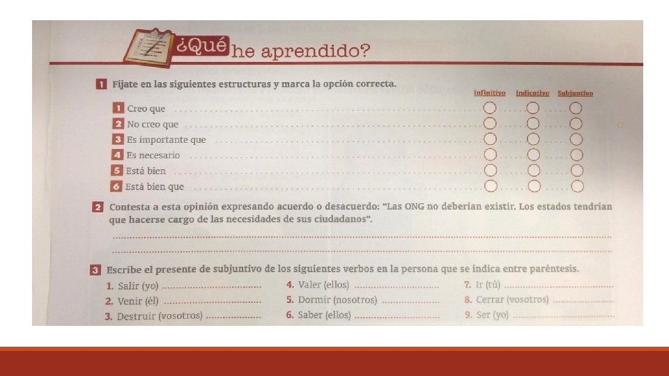 Aprendido 27 1. salga; 2. venga; 3. destruyáis; 4. valgan; 5. durmamos; 6. sepan; 7. vayas; 8. cerréis. 9. sea.