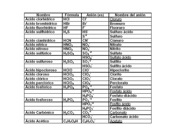 Aniones simples ____uro (cloruro, Cl-) + H+ Ácido _____hídrico (Ácido clorhídrico, HCl) Oxianiones + átomo O per_______ato (perclorato, Cl. O 4 -) + H+ Oxiácidos - átomo O ____ato ____ito hipo_____ito (clorato, Cl. O 3 -) + H+ Ácido _____ico Ácido clorico, HCl. O 3, Ácido perclorico, HCl. O 4 (clorito, Cl. O 2 -) (hipoclorito, Cl. O-) + H+ Ácido _____oso Ácido cloroso, HCl. O 2, Ácido hipocloroso, HCl. O, Si el atomo tiene tres valencias en el nombre no se considera la terminación per ato o ico
