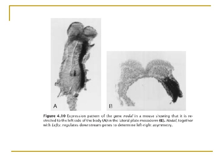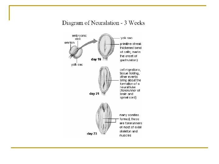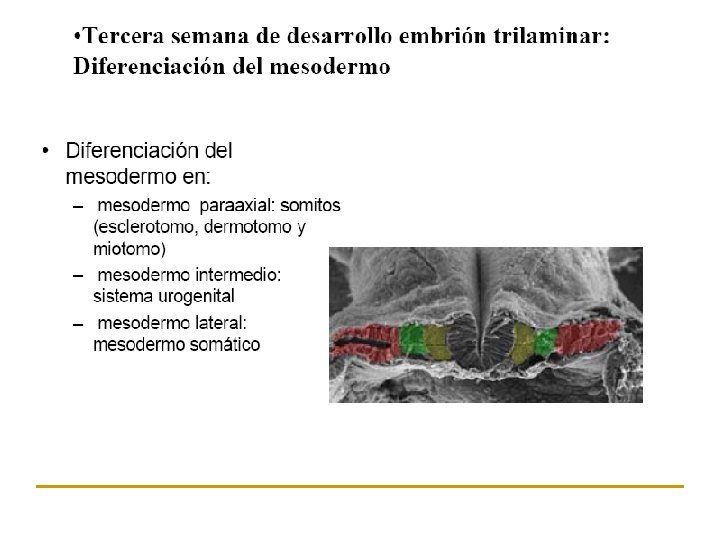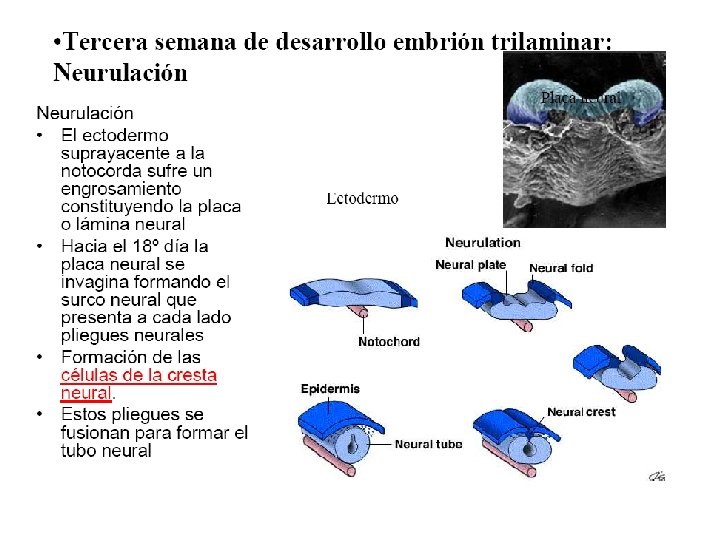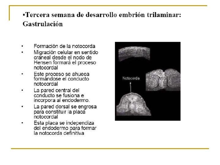 Gastrulación (días 13 al 21). n n Serie de migraciones celulares que determinan la aparición de la tercera hoja germinativa embrionaria: el mesodermo. Se caracteriza por una complejidad de eventos inductivos y movimientos celulares morfogenéticos que transforman al embrión bilaminar aplanado en uno trilaminar y alargado. Donde los principales ejes embrionarios (Anteroposterior, dorso-ventral e izquierda-derecha) ya se han definido.