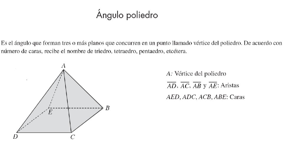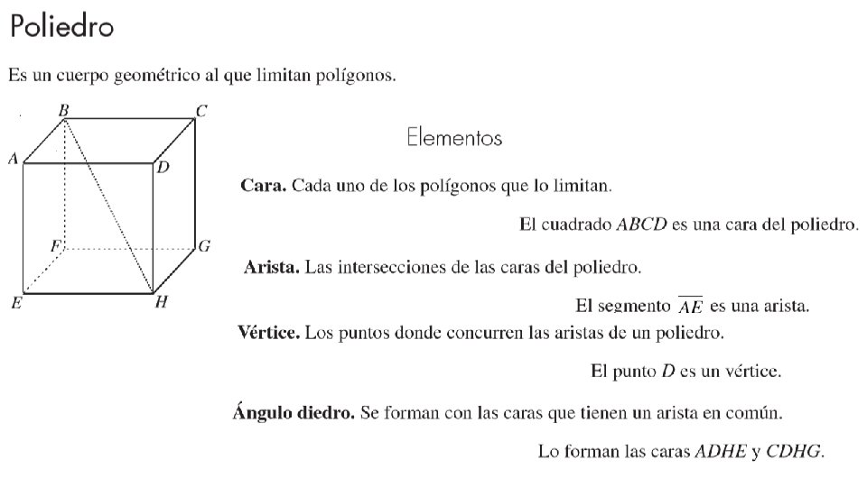 Un poliedro es un sólido que está limitado por polígonos, llamados caras , que encierran una sola región del espacio. Una arista de un poliedro es un segmento de línea formado por la intersección de dos caras. Un vértice de un poliedro es un punto donde se encuentran tres o más aristas. El plural de poliedro es poliedros o poliedros.