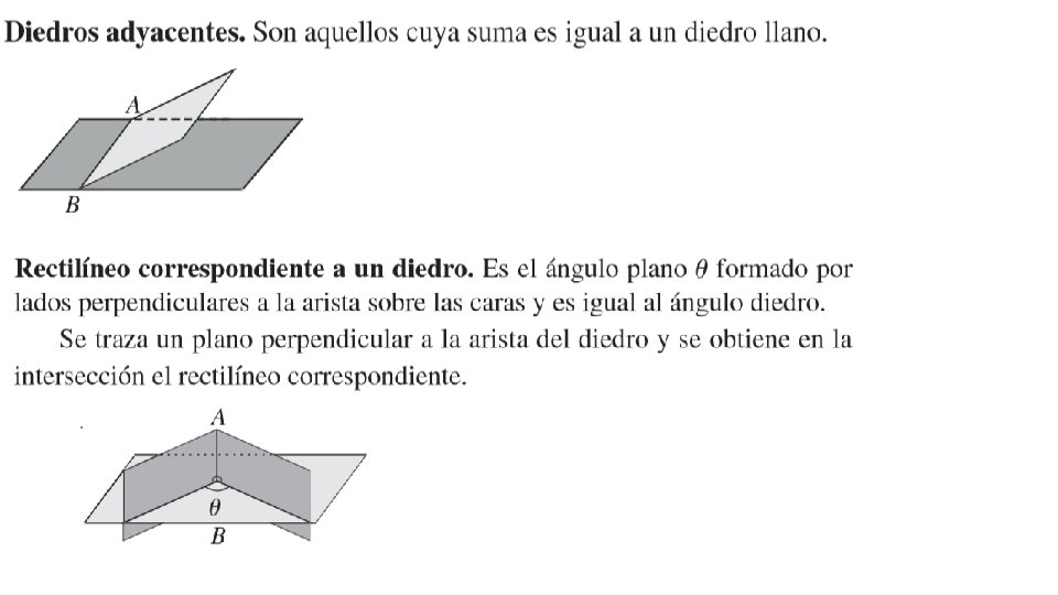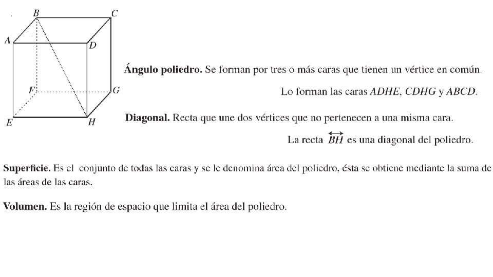 Un prisma es un poliedro con dos caras congruentes, llamadas bases, que se encuentran en planos paralelos. Las otras caras, llamadas caras laterales , son paralelogramos formados conectando los vértices correspondientes de las bases. Los segmentos que conectan estos vértices son aristas laterales. La altitud o altura de un prisma es la distancia perpendicular entre sus bases. En un prisma derecho cada aristas lateral es perpendicular a ambas bases. Los prismas que tienen aristas laterales que no son perpendiculares a las bases son prismas oblicuos. La longitud de las aristas laterales oblicuos es la altura inclinada del prisma. Los prismas se clasifican por las formas de sus bases. Por ejemplo, las figuras anteriores muestran un prisma rectangular y un prisma triangular. El área de un poliedro es la suma de las áreas de sus caras. El área lateral de un poliedro es la suma de las áreas de sus caras laterales. Prisma rectangular derecho Prisma triangular oblicuo