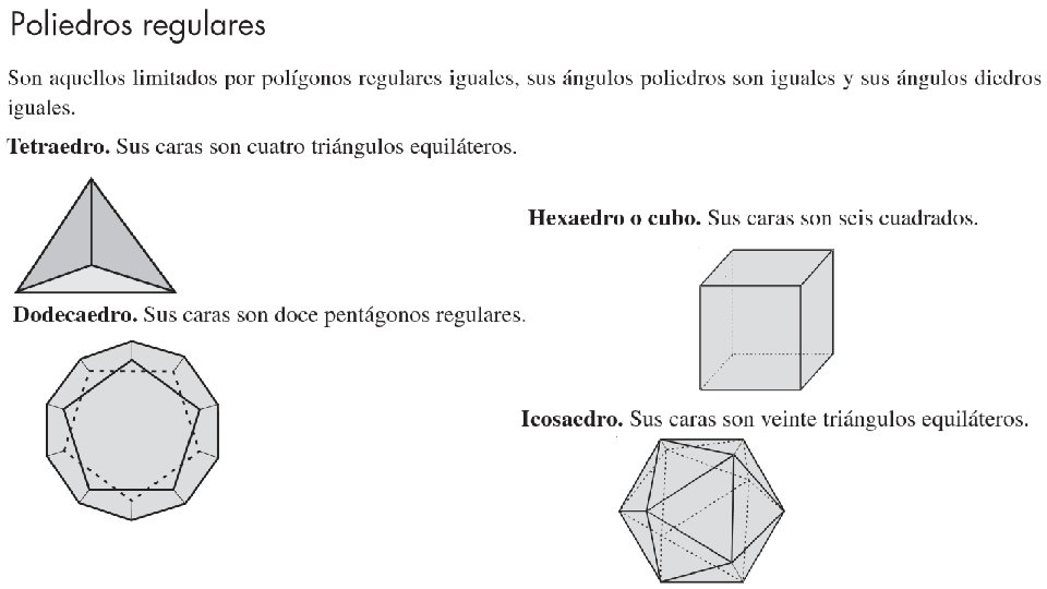 Hay cinco poliedros regulares, llamados sólidos platónicos, después del matemático y filósofo griego Platón. Los Solidos platónicos son regulares. Tetraedro (4 caras), un cubo (6 caras), un octaedro regular (8 caras), un dodecaedro regular (12 caras) y un icosaedro regular (20 caras). tetraedro regular 4 caras, 4 vértices, 6 aristas Dodecaedro regular 12 caras, 20 vértices, 30 aristas Cubo 6 caras, 8 vértices, 12 aristas Octaedro regular 8 caras, 6 vértices, 12 aristas Icosaedro regular 20 caras, 12 vértices, 30 aristas