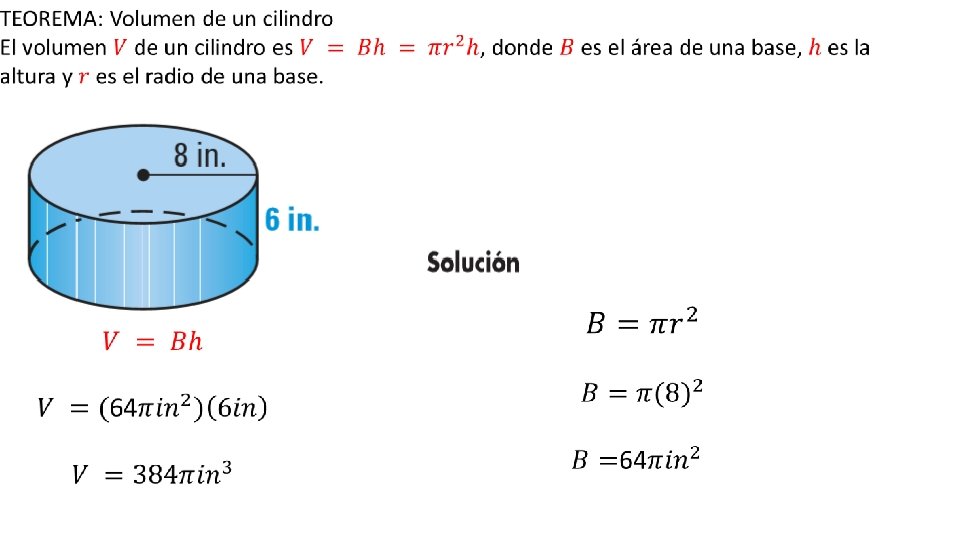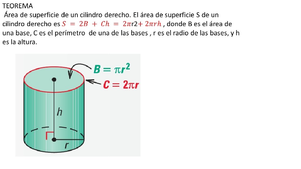 Un cilindro es un sólido con bases circulares congruentes que se encuentran en planos paralelos. La altitud, o altura, de un cilindro es la distancia perpendicular entre sus bases. El radio de la base también se llama el radio del cilindro. Un cilindro se llama cilindro derecho si el segmento que une los centros de las bases es perpendicular a las bases. El área lateral de un cilindro es el área de su superficie curva. El área lateral es igual al producto de la circunferencia y la altura, que es 2πrh. El total es igual a la suma del área lateral y las áreas de las dos bases.