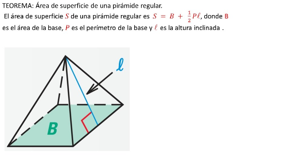 Área de superficie de una pirámide. Una pirámide es un poliedro en el que la base es un polígono y las caras laterales son triángulos con un vértice común. La intersección de dos caras laterales es una arista lateral. La intersección de la base y una cara lateral es una arista de la base. La altitud, o altura, de la pirámide es la distancia perpendicular entre la base y el vértice. Pirámide regular Una pirámide regular tiene un polígono regular en su base y su altura se encuentra con la base en su centro. La altura inclinada de una pirámide regular es la altitud de cualquier cara lateral. Una pirámide no regular no tiene una altura inclinada.