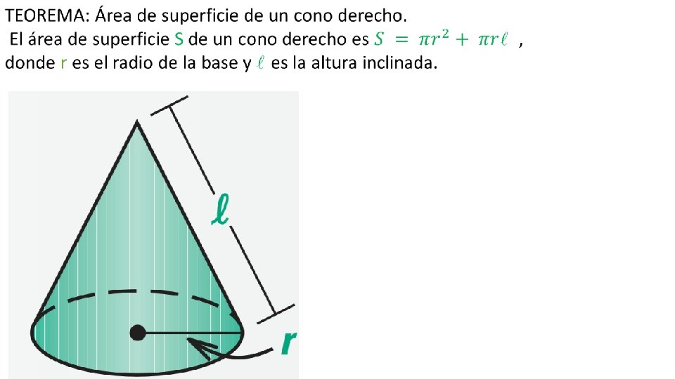 Área de superficie de un cono. Un cono circular o cono tiene una base circular y un vértice que no está en el mismo plano que la base. La altitud, o altura, es la distancia perpendicular entre el vértice y la base. En un cono derecho, la altura se encuentra con la base en su centro y la altura inclinada es la distancia entre el vértice y un punto en el borde de la base. La superficie lateral de un cono consta de todos los segmentos que conectan el vértice con los puntos en el borde de la base.