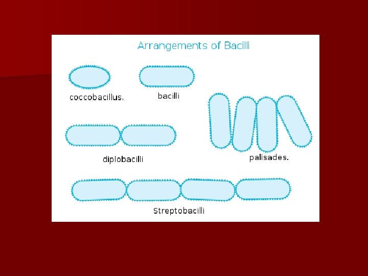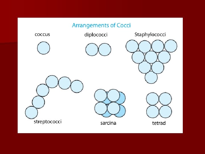Agrupaciones n Si la tendencia a permanecer unidas es mayor y por más tiempo, nos encontramos con varias posibilidades, dependiendo del número de planos de división y de la relación entre ellos: – Estreptococos o estreptobacilos n Si existe más de un plano de división, en el caso de cocos podemos encontrar tres posibilidades: – dos planos perpendiculares: tétradas o múltiplos – tres planos ortogonales: sarcinas (paquetes cúbicos) – muchos planos de división: estafilococos (racimos irregulares). n Bacilos: en empalizada, en V o L, “letras chinas”.