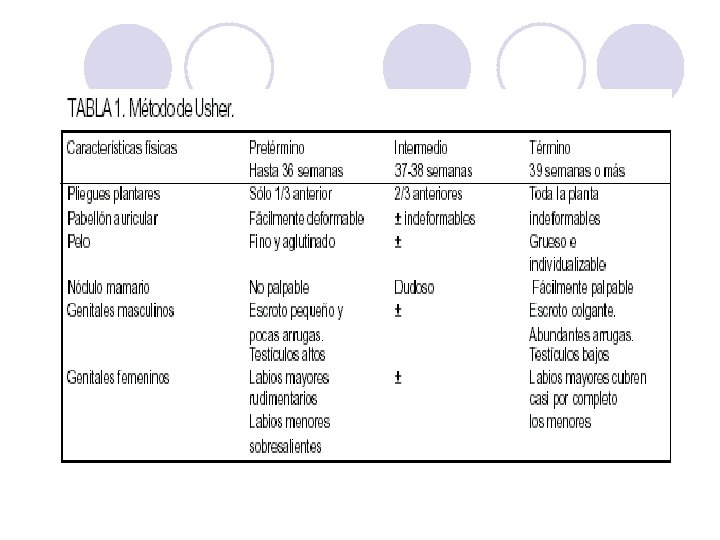 Ventajas del Método de Usher ( Ex. Somático) Describe caracteres físicos externos del RN que presenta diferenciación en el último mes de gestación. § Se alteran muy poco con el Retardo del Crecimiento Intrauterino. § Seguridad de + 2 semanas. § Fácil de realizar. §