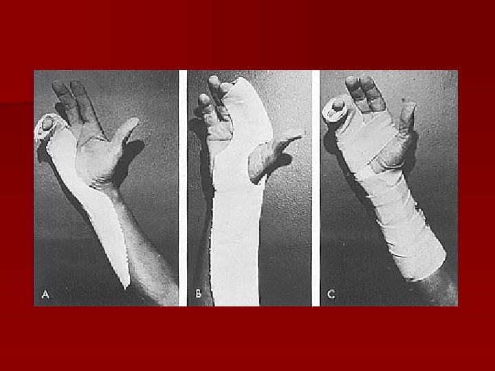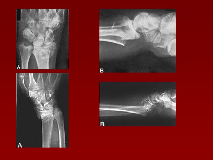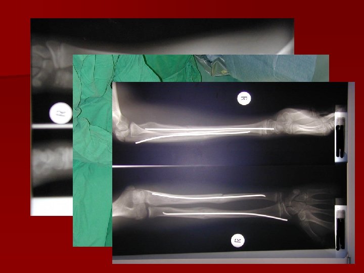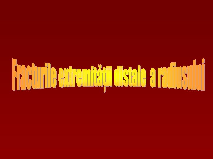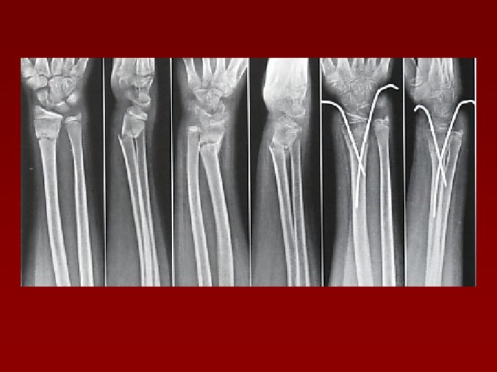 Tratament ortopedic – indicaţii: Fracturi simple, fără/cu moderată deplasare n Fracturi cu traiect transversal, stabile după reducere n Fracturile foarte cominutive cu deplasare n Aparat gipsat brahio-palmar, cotul la 90º, mâna în supinaţie ! Rtg săptămânal, în primele 4 săptămâni !