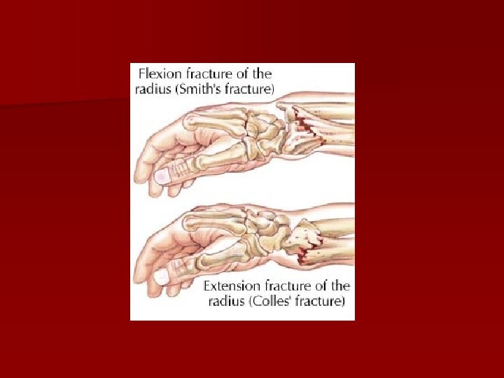 Tipuri de fractură n Fractura simplă n Fractura Essex-Lopresti Fractura gâtului radial + dislocaţie radioulnară distală n Fractura - dislocaţie Galeazzi (Monteggia inversată): Fractura 1/3 distale + dislocaţie radioulnară distală