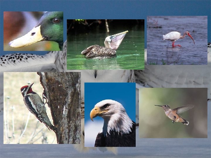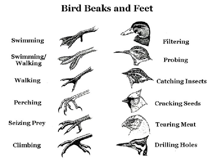 Beak • • Also called “bills” Made of keratin Nostrils function in breathing Variety of beak shapes reflects a wide range of functions • Beaks are not used for chewing, though some are used to break food into smaller pieces